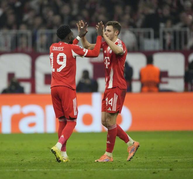 第70分鐘萊默爾右路挑傳禁區(qū),卡爾停球抽射一氣呵成,幫助拜仁2-1實(shí)現(xiàn)反超,17歲290天的卡爾也成為了歐冠歷史上最年輕連續(xù)三場比賽取得進(jìn)球的球員,7分鐘之后拜仁鎖定勝局,基米希右路45°傳中,格納布里頭球擺渡到門前,若納坦塔頭球接力破門,打進(jìn)自己歐冠生涯首球,將比分定格為了3-1。